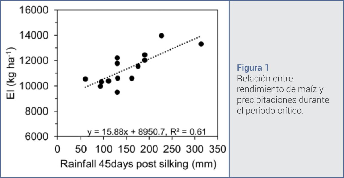 El 61 % de la variabilidad en los rendimientos estuvo explicado por diferencias en las lluvias entre campañas. Particularmente, el período crítico comprendido entre los 45 días posteriores a floración fue clave para definir el potencial productivo. En los ambientes de alto rendimiento, las precipitaciones superaron los 220 mm, mientras que en los de menor productividad se ubicaron por debajo de los 110 mm.