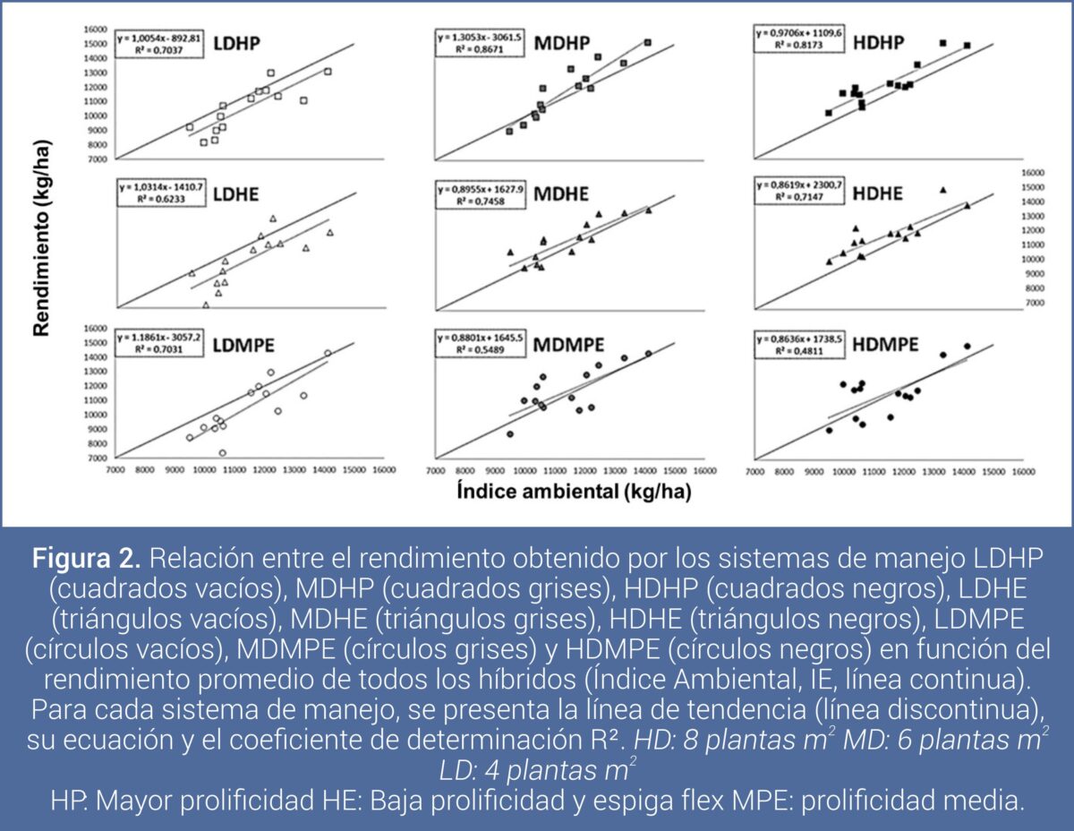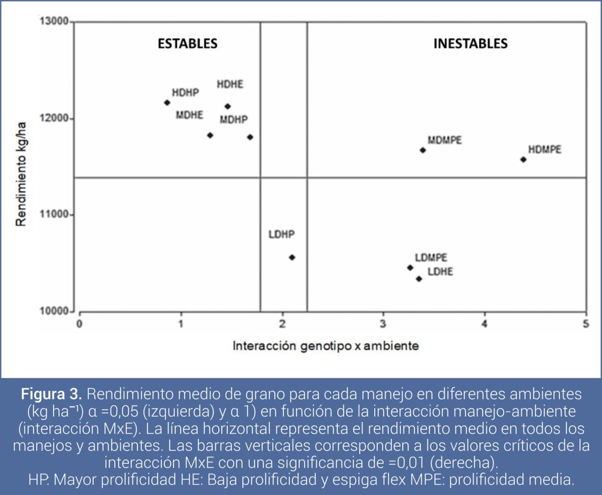 Las diferencias en estabilidad entre estrategias de manejo también quedan reflejadas en la Figura 3, que sintetiza el comportamiento de las distintas combinaciones de densidad e híbrido a lo largo de los ambientes analizados. Por el contrario, los planteos de baja densidad mostraron los niveles más bajos de estabilidad, independientemente del tipo de híbrido.