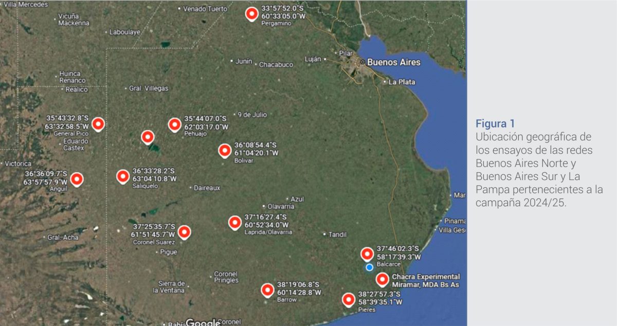 La Red Nacional de Evaluación de Cultivares de Girasol dio a conocer los resultados de la campaña 2024/25 en las regiones de Buenos Aires y La Pampa, a través de un informe técnico realizado en el marco del convenio INTA-ASAGIR. En este relevamiento, participaron numerosos equipos de experimentación y análisis distribuidos en localidades clave del corazón girasolero argentino, como Balcarce, Miramar, Pergamino, Trenque Lauquen, General Pico y Anguil, entre otras (Figura 1).