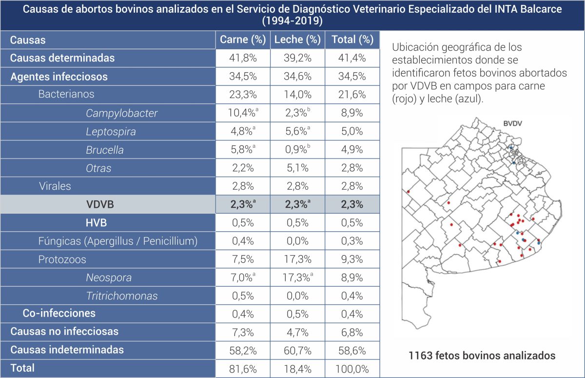 La relación entre DVB y desordenes reproductivos ha sido documentada en numerosos trabajos y es una de las principales causas de pérdidas económicas. Sin embargo, la confirmación diagnóstica no siempre resulta sencilla. En la casuística del Servicio de Diagnóstico Veterinario Especializado del INTA Balcarce, los abortos asociados a infecciones con DVB representan la principal causa viral, siendo responsable del 2,3% de los abortos en sistemas de producción de carne y leche de la región Central de Argentina (Cantón et al., 2022, Spetter et al., 2022) (Tabla 1).
