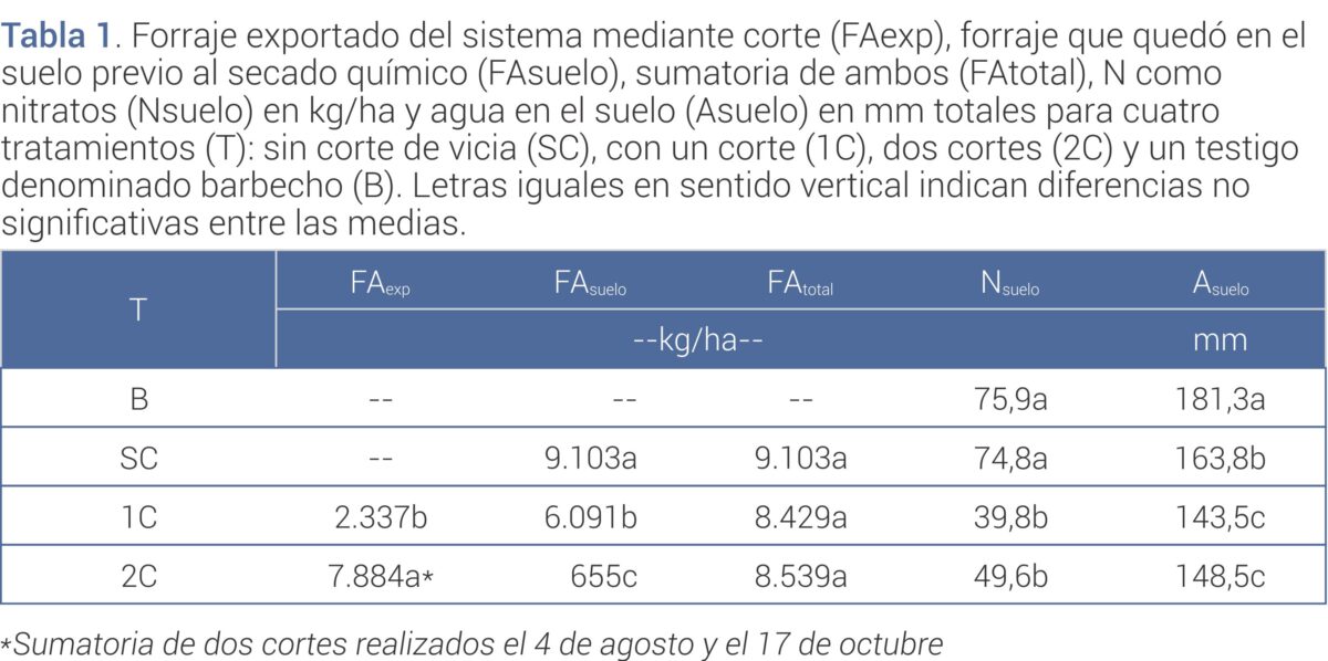 Más allá de la fecha de secado, el estudio incorporó un aspecto central para los sistemas mixtos: el efecto del aprovechamiento del cultivo con destino a forraje. Los resultados mostraron que la producción total de biomasa fue similar independientemente del manejo (sin cortes, uno o dos cortes). Sin embargo, la diferencia radicó en el destino de ese forraje: en los tratamientos sin corte, la mayor parte permaneció sobre el suelo, mientras que en los sistemas con cortes una proporción significativa fue exportada del sistema. Este punto es clave, ya que define si la vicia cumple principalmente un rol de “servicio convencional” o si se utiliza como recurso forrajero.