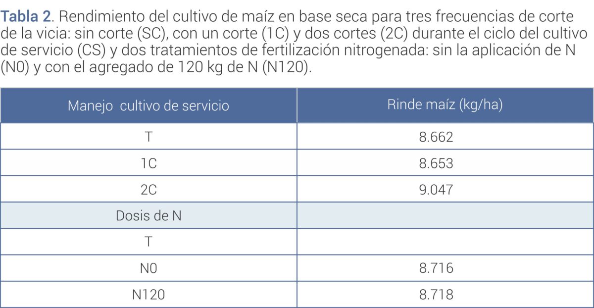 Dos semanas después de secado químico del cultivo de servicio se evaluó el contenido de nitratos y el agua en el suelo (hasta 60 cm de profundidad). Además, a comienzos de noviembre se sembró maíz y en el estado fenológico V6, a la mitad de cada parcela se le agregaron 120 kg N/ha como urea y la otra mitad no fue fertilizada, para analizar la respuesta del cultivo ante diferentes manejos de la vicia y fertilización nitrogenada. El maíz se cosechó en madurez fisiológica y se determinó el rendimiento en kg/ha.
